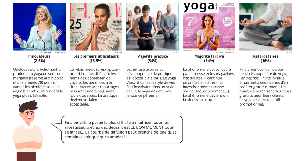 Pour qu’une tendance prenne racine dans la société, il est essentiel que l’innovateur qui la porte possède un certain charisme et soit légitimé par la masse ou par un autre leader, tel qu'un expert dans son domaine. Par « pionniers », nous incluons les innovateurs et les premiers utilisateurs. Voici quelques exemples :